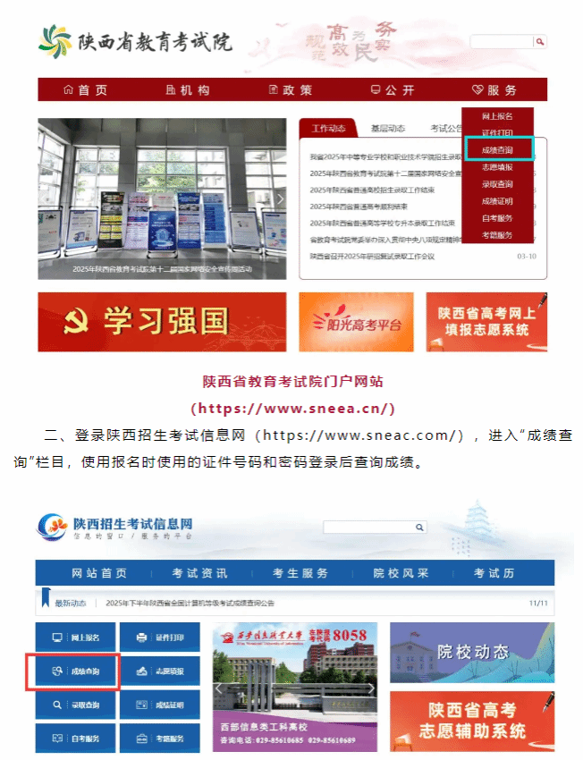 一、登录陕西省教育考试院门户网站(https://www.sneea.cn/),点击“服务”,进入“成绩查询”栏目,点击“2025年陕西省成人高校招生全国统一考试”,进入“陕西省成人高校招生考生服务平台”,使用报名时使用的证件号码和密码登录后查询成绩。