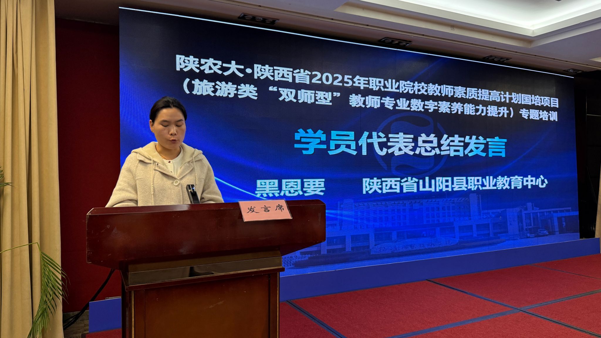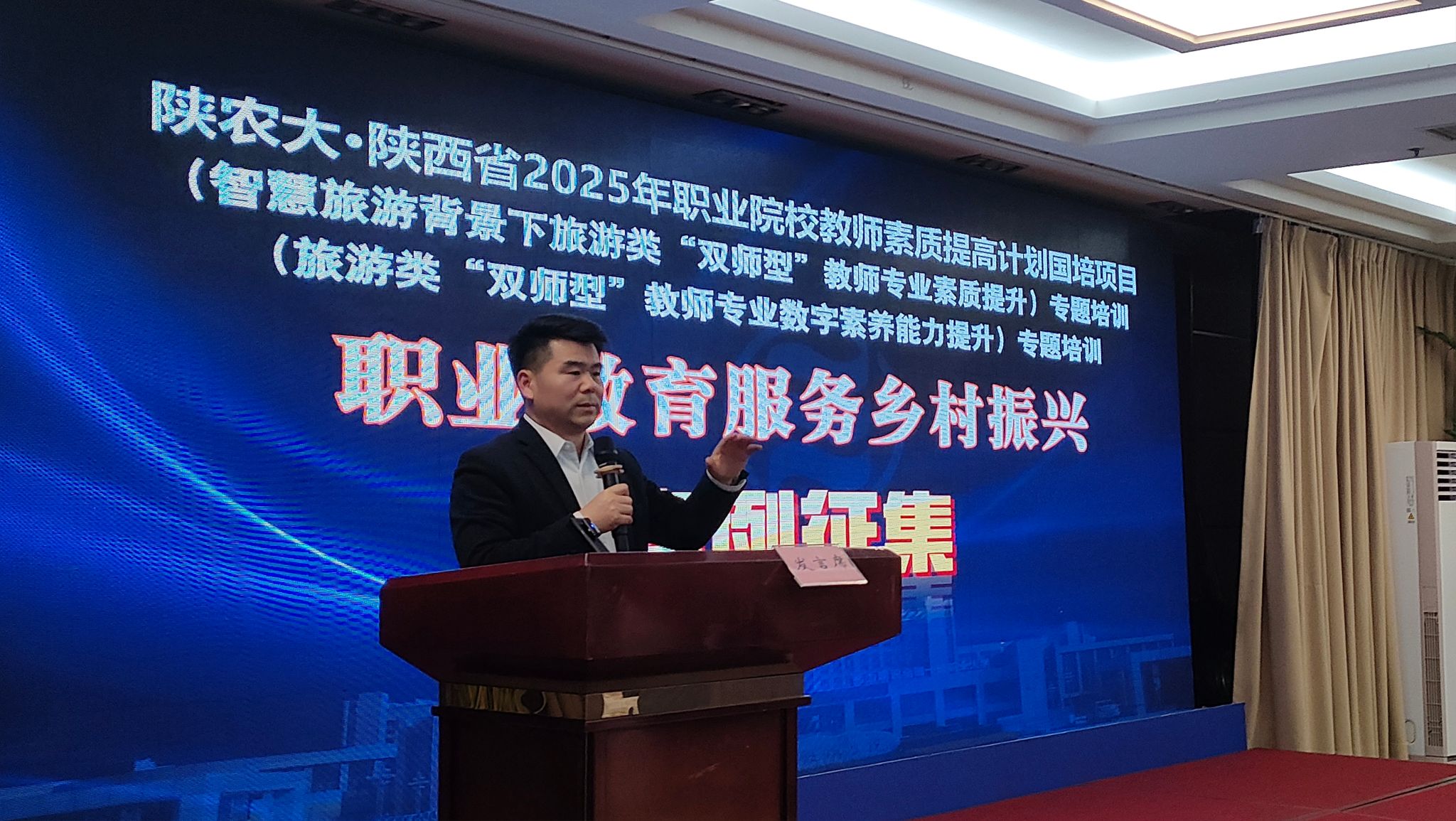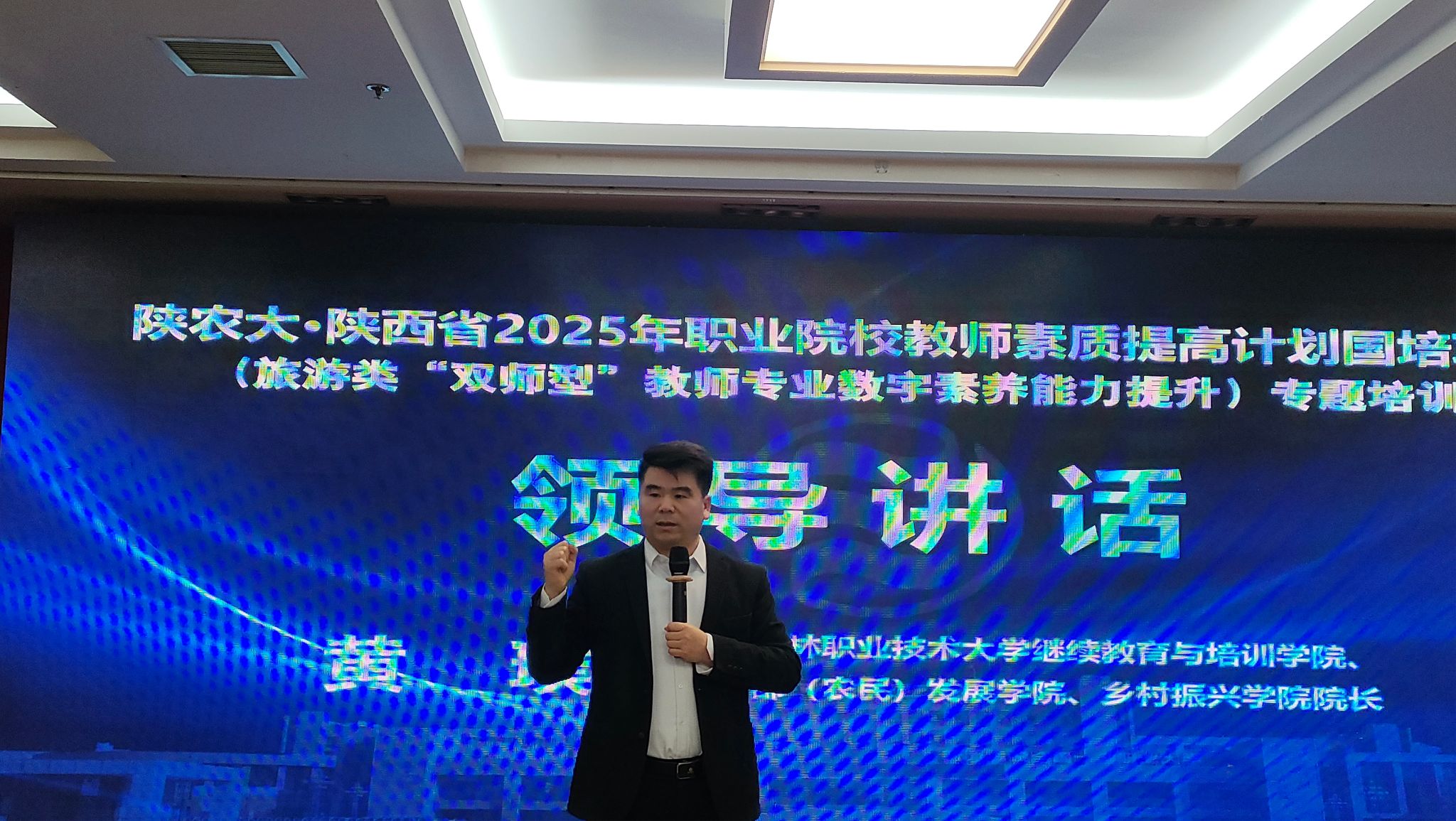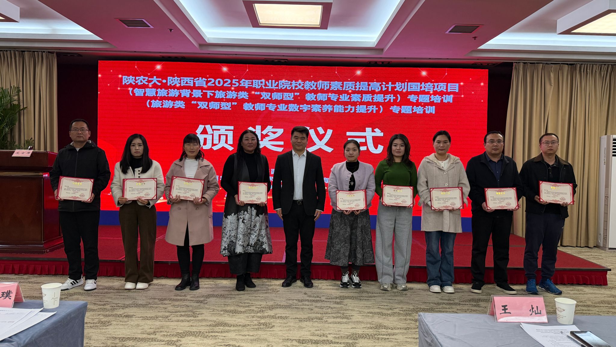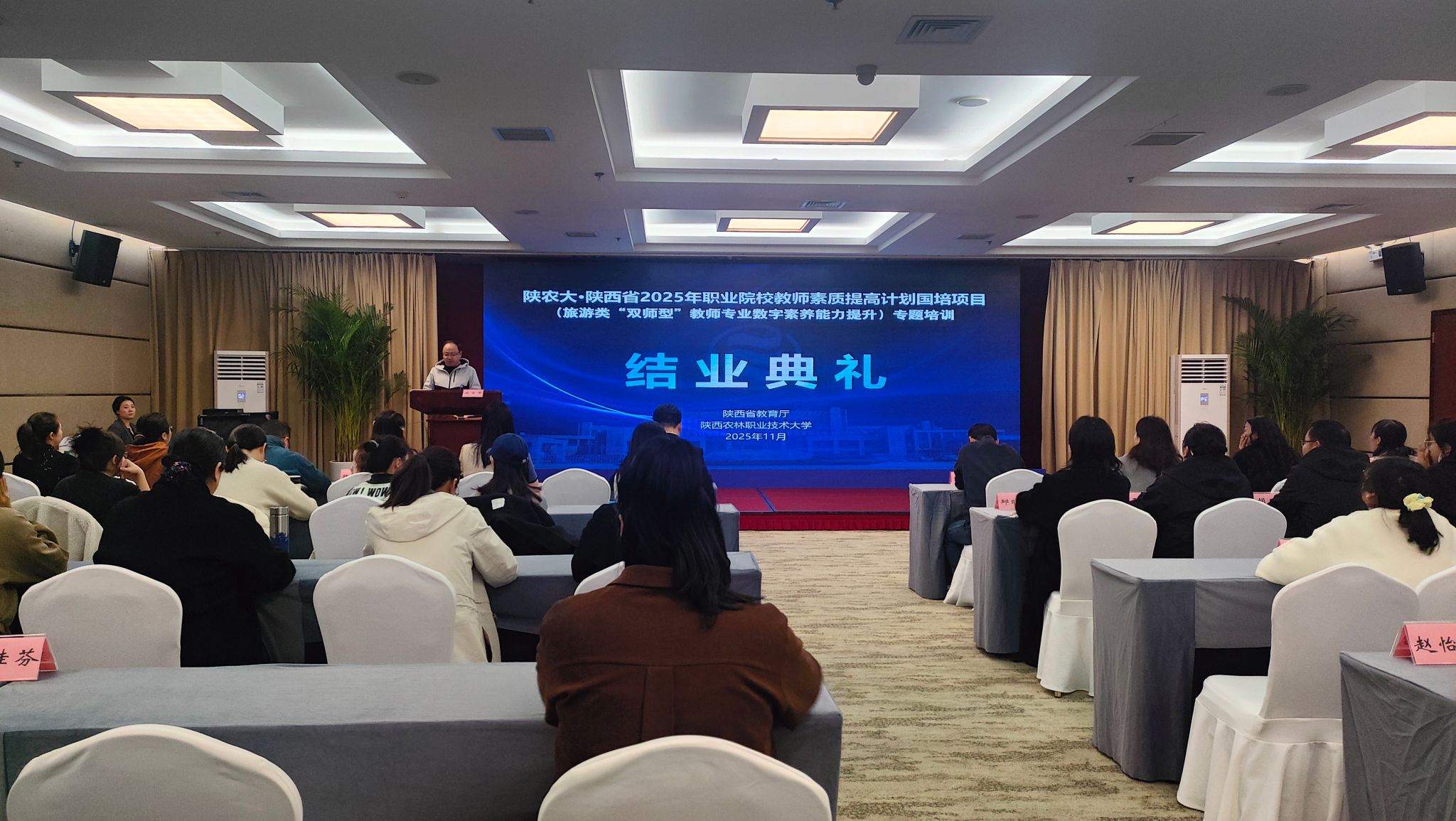 11月19日上午,由陕西省教育厅主办,陕西农林职业技术大学承办的陕西省2025年度职业院校教师素质提高计划国培项目(旅游类双师型教师专业数字素养能力提升)教师专题培训圆满结业。陕西农林职业技术大学继续教育与培训学院、村干部(农民)发展学院、乡村振兴学院院长黄璞、继续教育与培训学院办公室主任王灿等出席结业仪式。