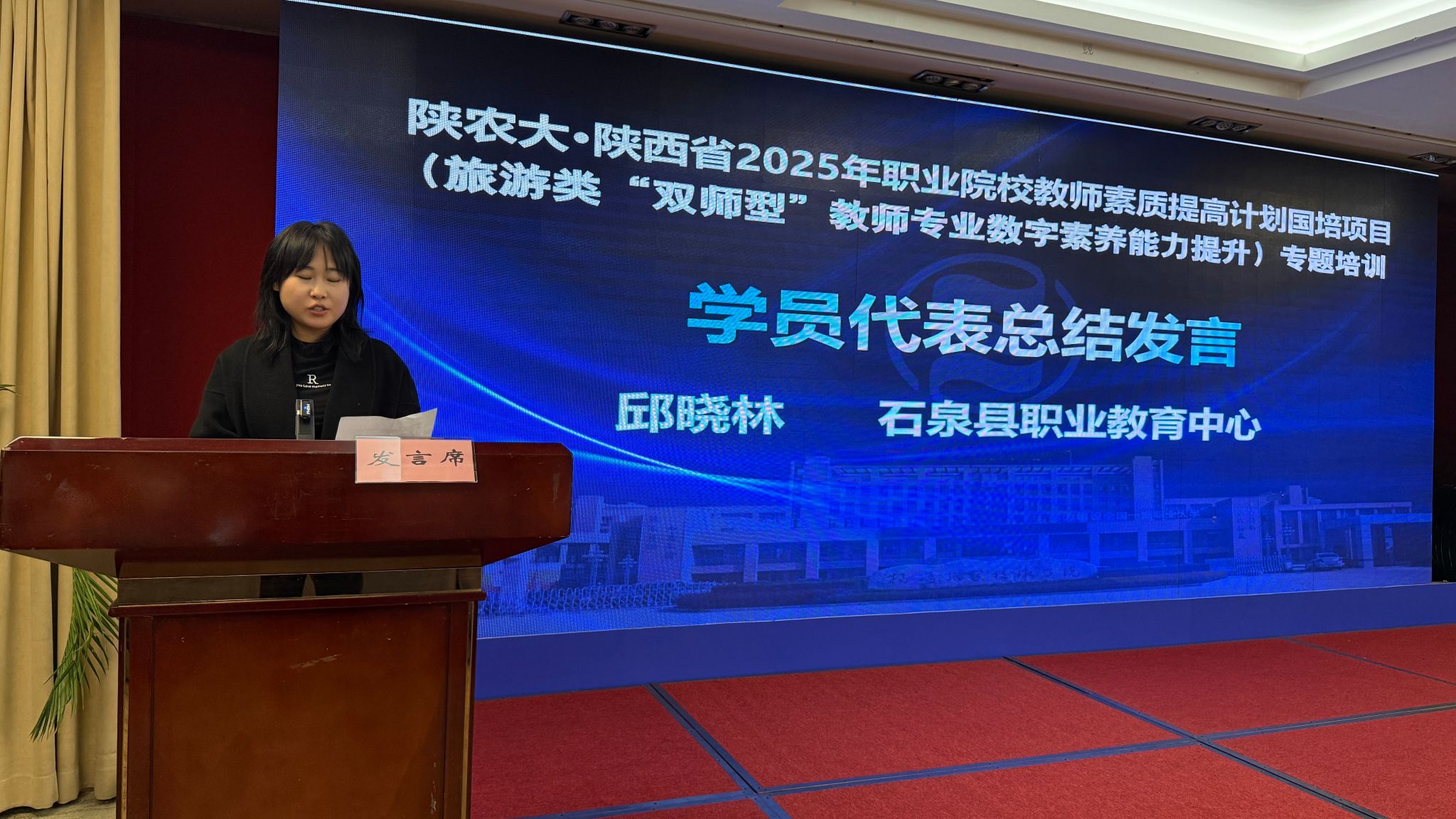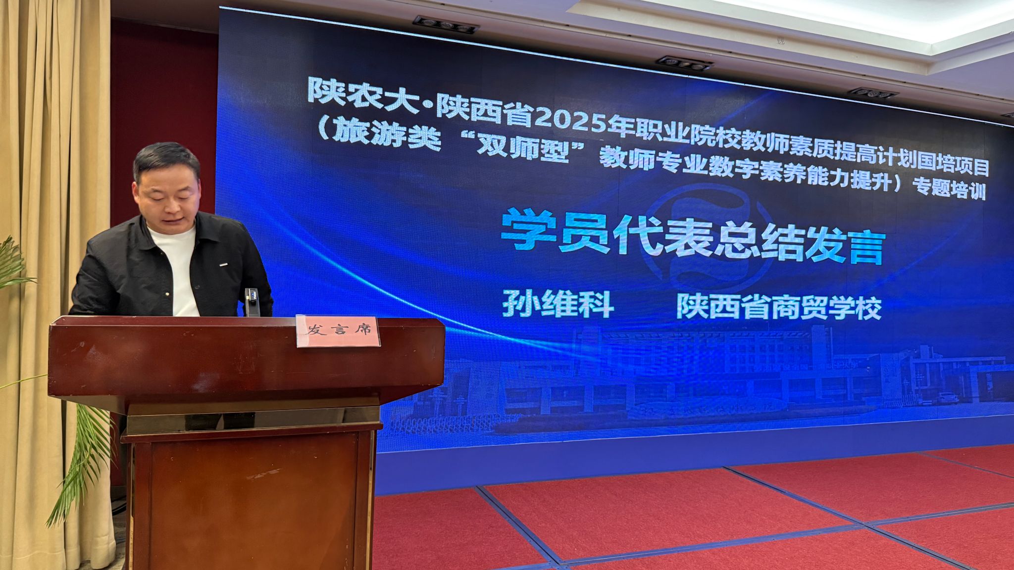 陕西省商贸学校孙维科、陕西省山阳县职业教育中心黑恩要、石泉县职业教育中心邱晓林作汇报总结,共同分享了本次培训的深刻感悟与收获。他们说道,此次培训不仅拓展了知识视野,升级了专业技能,更促进了思想的碰撞与友谊的积淀。“纸上得来终觉浅,绝知此事要躬行。”他们承诺,将勇担数字素养提升的践行者,积极应用智能技术,创新教学模式;做好文化传承的引路人,深化课程思政,培养具有文化底蕴的旅游人才;永葆“双师型”教师本色,锤炼专业技能,服务区域文旅发展,争做学生成长的“经师”与“能师”。