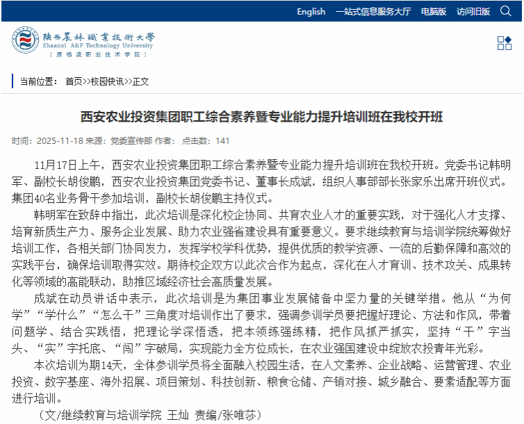 11月17日上午,西安农业投资集团职工综合素养暨专业能力提升培训班在我校开班。党委书记韩明军、副校长胡俊鹏,西安农业投资集团党委书记、董事长成斌,组织人事部部长张家乐出席开班仪式。集团40名业务骨干参加培训,副校长胡俊鹏主持仪式。