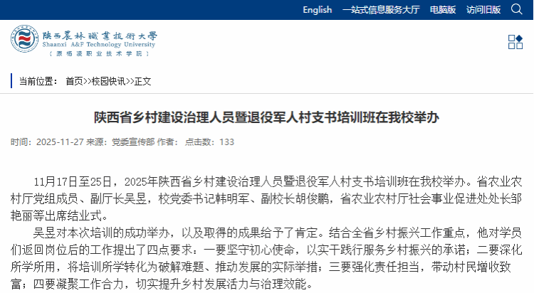 11月17日至25日,2025年陕西省乡村建设治理人员暨退役军人村支书培训班在我校举办。省农业农村厅党组成员、副厅长吴昱,校党委书记韩明军、副校长胡俊鹏,省农业农村厅社会事业促进处处长邹艳丽等出席结业式。
