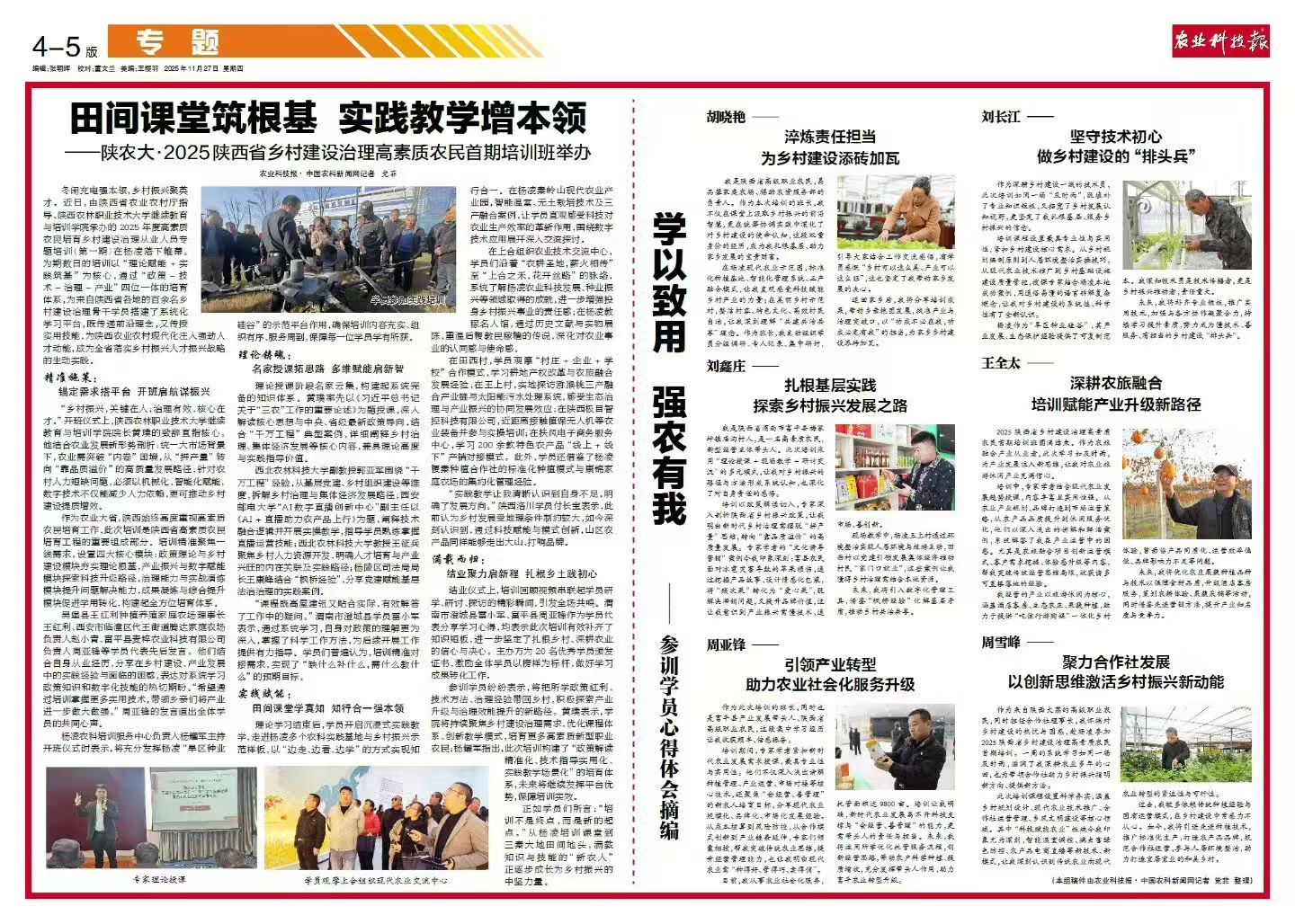11月27日,《农业科技报》以整版篇幅,聚焦我校主办的“陕农大·2025陕西省乡村建设治理高素质农民首期培训班”,全面报道了本次培训的创新模式与实践成效。