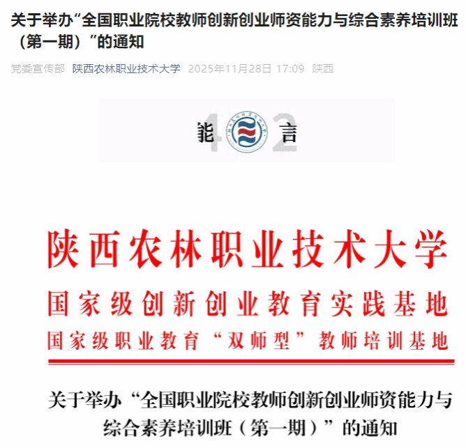 为深入贯彻落实党的二十大关于实施科教兴国、人才强国和创新驱动发展战略的目标要求,落实中共中央、国务院印发《教育强国建设规划纲要(2024—2035年)》精神,加快推进职普融通、产教融合、科教融汇,进一步激发职业教育创新创业活力,我单位拟举办“全国职业院校教师创新创业师资能力与综合素养培训班(第一期)”。现将有关事项通知如下: