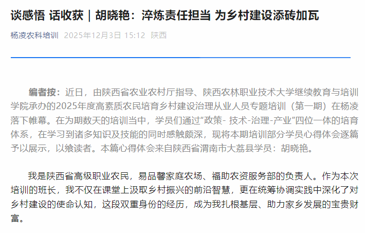 近日,由陕西省农业农村厅指导、陕西农林职业技术大学继续教育与培训学院承办的2025年度高素质农民培育乡村建设治理从业人员专题培训(第一期)在杨凌落下帷幕。在为期数天的培训当中,学员们通过“政策- 技术-治理-产业”四位一体的培育体系,在学习到诸多知识及技能的同时感触颇深,现将本期培训部分学员心得体会逐篇予以展示,以飨读者。本篇心得体会来自陕西省渭南市大荔县学员:胡晓艳。