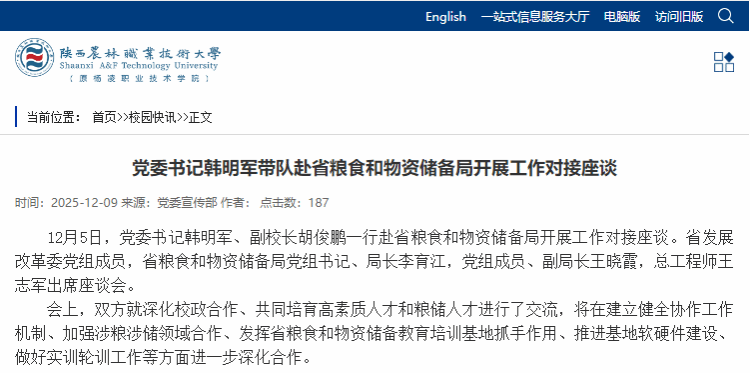 12月5日,党委书记韩明军、副校长胡俊鹏一行赴省粮食和物资储备局开展工作对接座谈。省发展改革委党组成员,省粮食和物资储备局党组书记、局长李育江,党组成员、副局长王晓霞,总工程师王志军出席座谈会。