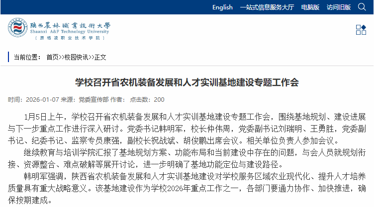 韩明军强调,陕西省农机装备发展和人才实训基地建设对学校服务区域农业现代化、提升人才培养质量具有重大战略意义。该基地建设作为学校2026年重点工作之一,各部门要通力协作、加快推进,确保按期建成。