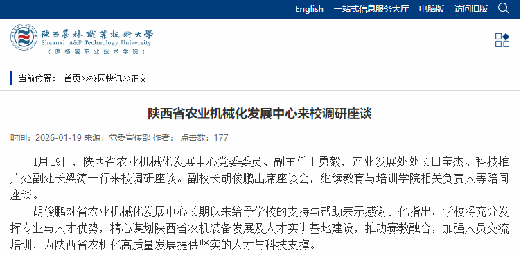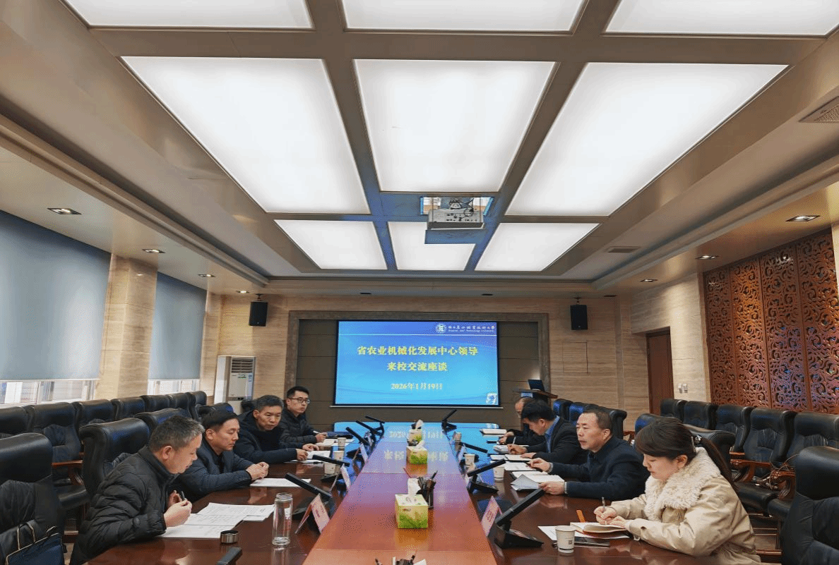 1月19日,陕西省农业机械化发展中心党委委员、副主任王勇毅,产业发展处处长田宝杰、科技推广处副处长梁涛一行来校调研座谈。副校长胡俊鹏出席座谈会,继续教育与培训学院相关负责人等陪同座谈。