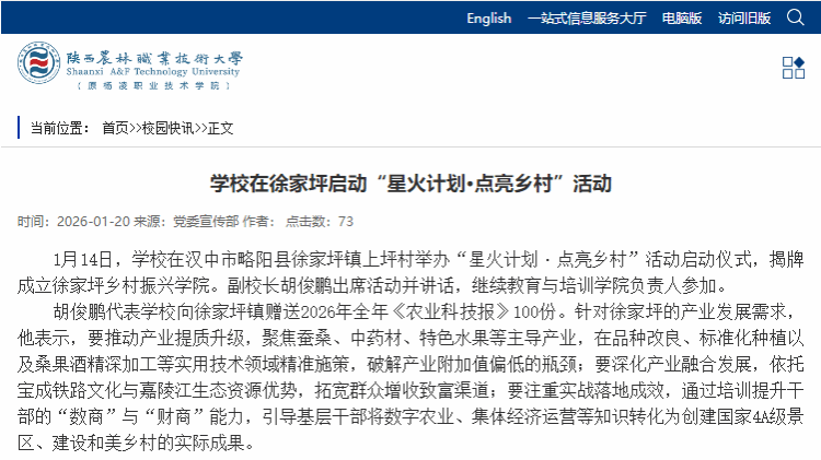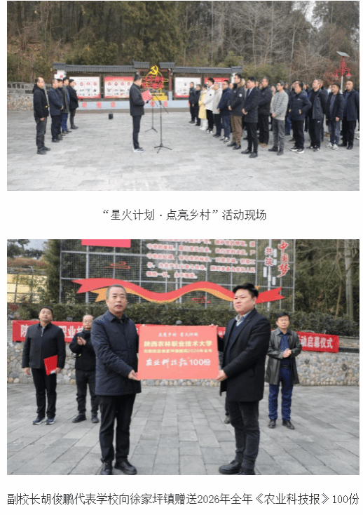 1月14日,学校在汉中市略阳县徐家坪镇上坪村举办“星火计划·点亮乡村”活动启动仪式,揭牌成立徐家坪乡村振兴学院。副校长胡俊鹏出席活动并讲话,继续教育与培训学院负责人参加。