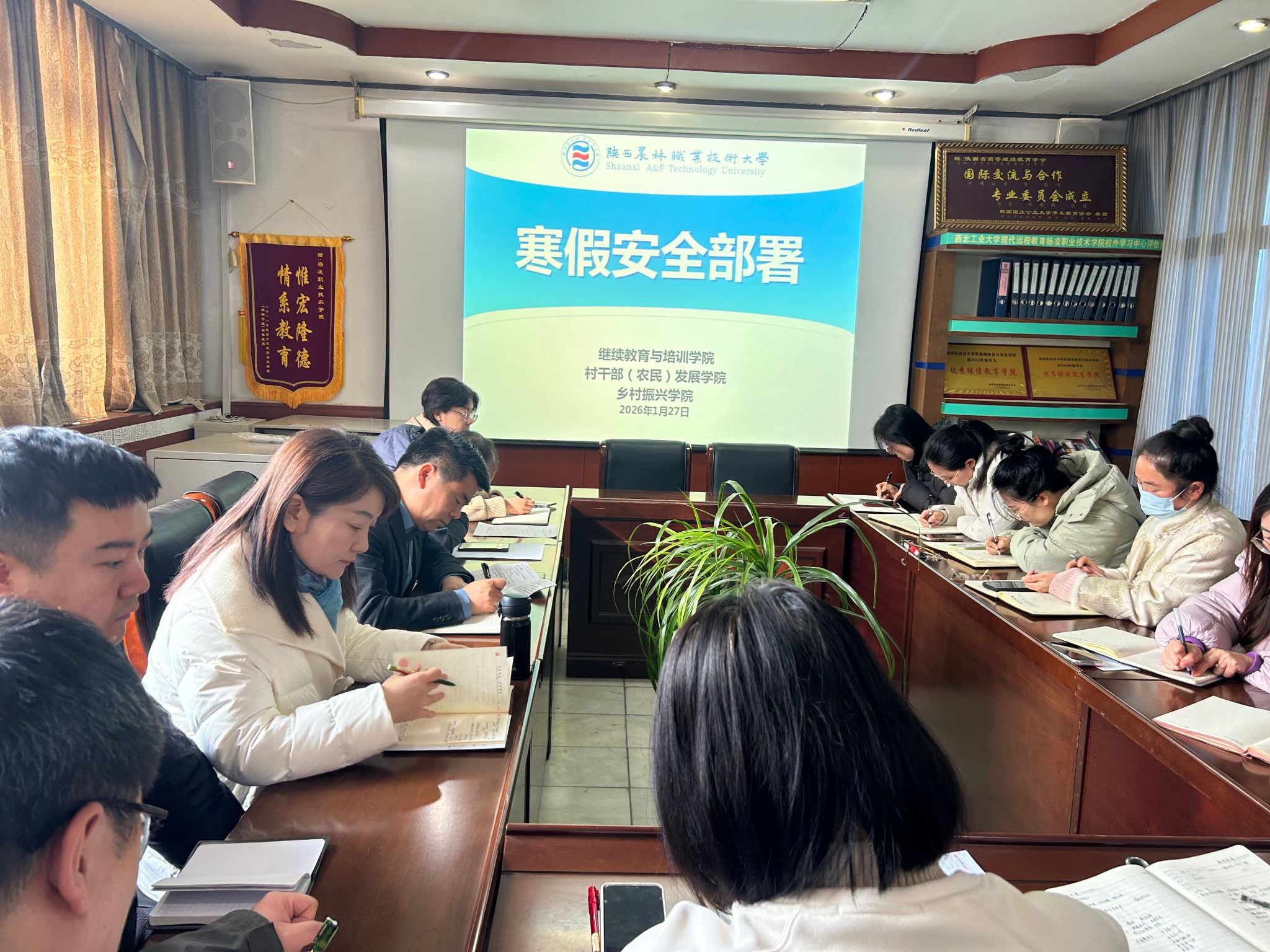 会上,办公室主任王灿带领大家学习了《关于2026年放寒假的通知》,随后黄院长传达了学校例会上关于寒假安全工作的相关文件精神与要求,并结合近期全国范围内校园安全工作典型案例,特别强调了寒假期间安全工作的特殊性与重要性。他指出,全体成员要提高政治站位,始终把安全放在首位,遵守学校相关精神和要求,严格遵守中央八项规定精神,注意做好放假前办公区域安全排查,扎实做好各项安全保障工作,确保大家度过一个廉洁、平安、健康、快乐的假期。