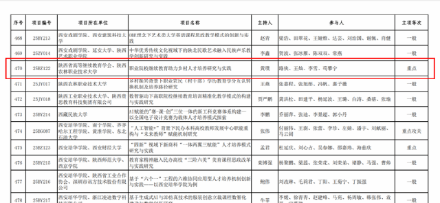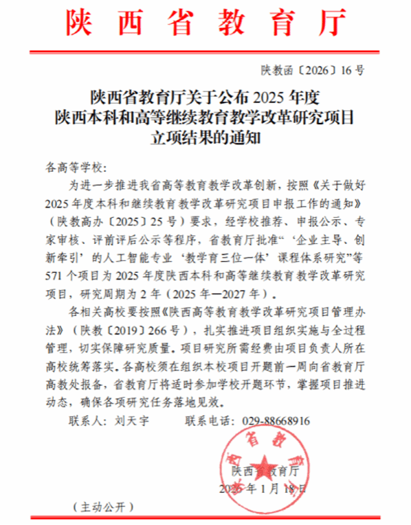 近日,陕西省教育厅正式公布了本科和高等继续教育教学改革研究项目立项结果。由我院教师团队牵头申报的《职业院校继续教育助力乡村人才培养研究与实践》项目,经学校推荐、专家评审、公示等环节,最终成功获得立项,标志着我院在深化教学改革、创新人才培养模式方面的探索与实践获得了省级层面的认可。