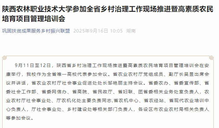 9月11日至12日,陕西省乡村治理工作现场推进暨高素质农民培育项目管理培训会在安康举行,我校作为全省唯一高校代表参加会议。省农业农村厅党组成员、副厅长吴昱出席会议并讲话,省农业农村厅社会事业促进处处长邹艳丽主持会议。省委农办、省委宣传部、省委社会工作部、省委网信办、省高院、省民政厅、省妇联、团省委相关业务处室负责人,农业农村厅社会事业处、厅农机化处主要负责同志,省农机中心、省农经站、省现代农业培训中心负责人,厅社会事业处、乡村建设处等相关部门负责人,各设区市农业农村局相关负责人等参加会议。