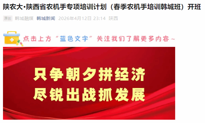 4月10日,陕农大·陕西省农机手专项培训计划(春季农机手培训韩城班)正式开班,全市的农机手齐聚一堂,开启为期6天的系统化技能提升培训,为春耕生产注入专业技术动能,筑牢农机安全生产防线。