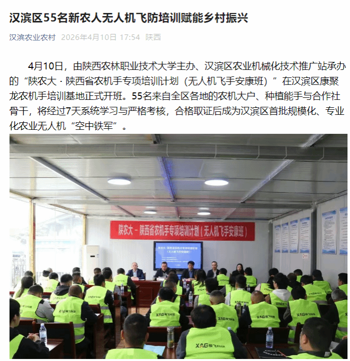 4月10日,由陕西农林职业技术大学主办、汉滨区农业机械化技术推广站承办的“陕农大・陕西省农机手专项培训计划(无人机飞手安康班)”在汉滨区康聚龙农机手培训基地正式开班。55名来自全区各地的农机大户、种植能手与合作社骨干,将经过7天系统学习与严格考核,合格取证后成为汉滨区首批规模化、专业化农业无人机“空中铁军”。