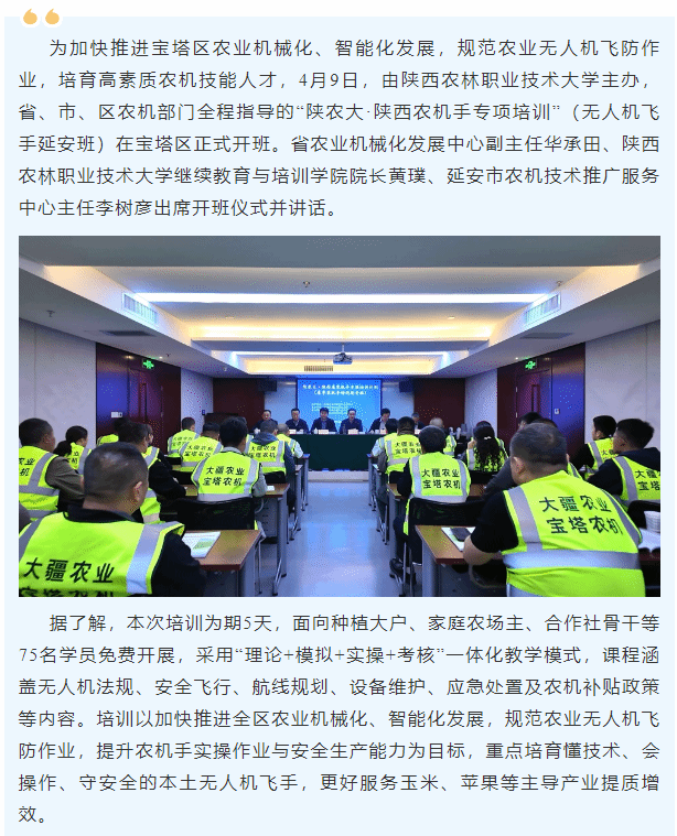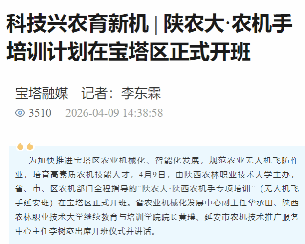 上一条:【媒体聚焦 宝塔区农机中心发布】春潮涌动耕新篇 育才启程兴农耕 --陕农大·陕西省农机手专项培训(无人机飞手延安班)开班 下一条:【媒体聚焦 陕西省农业机械化发展中心发布】春潮涌动耕新篇 育才启程兴农耕 ——陕农大·陕西省农机手专项培训(无人机飞手延安班)开班