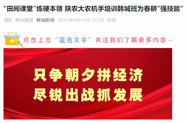 4月14日,陕农大·陕西省农机手专项培训计划(春季农机手培训韩城班)进入核心实操环节。在实训田间,农机专家手把手教学,让农机手们在实战中练本领、强技能。