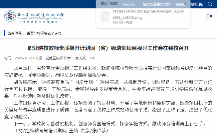 10月22日,省教育厅专项视导工作组来校,就职业院校教师素质提高计划国家级和省级培训项目的实施情况开展专项视导。副校长胡俊鹏参加视导会。