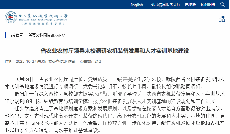 10月24日,省农业农村厅副厅长、党组成员、一级巡视员任步学来校,就陕西省农机装备发展和人才实训基地建设情况进行专项调研。党委书记韩明军、校长仲伟周、副校长胡俊鹏陪同调研。