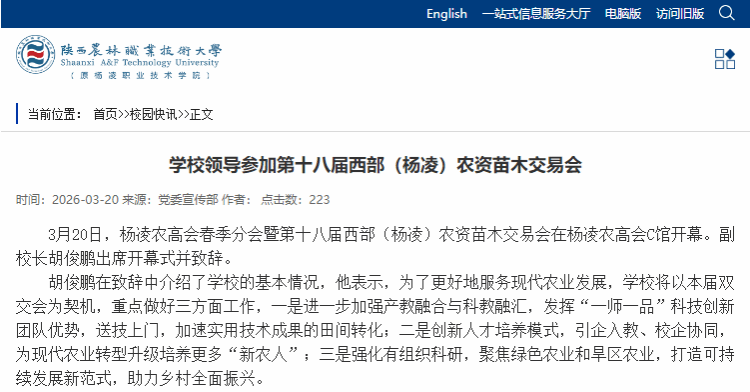 3月20日,杨凌农高会春季分会暨第十八届西部(杨凌)农资苗木交易会在杨凌农高会C馆开幕。副校长胡俊鹏出席开幕式并致辞。