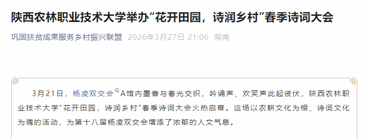 3月21日,杨凌双交会A馆内墨香与春光交织,吟诵声、欢笑声此起彼伏,陕西农林职业技术大学“花开田园,诗润乡村”春季诗词大会火热启幕。这场以农耕文化为根、诗词文化为魂的活动,为第十八届杨凌双交会增添了浓郁的人文气息。