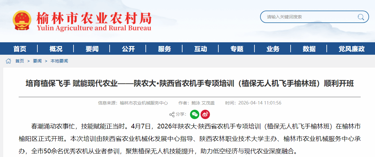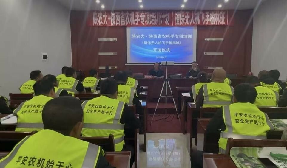 春潮涌动农事忙,技能赋能正当时。4月7日,2026年陕农大·陕西省农机手专项培训(植保无人机飞手榆林班)在榆林市榆阳区正式开班。本次培训由陕西省农业机械化发展中心指导、陕西农林职业技术大学主办、榆林市农业机械服务中心承办,全市50余名优秀农机从业者参训,聚焦植保无人机技能提升,助力低空经济与现代农业深度融合。