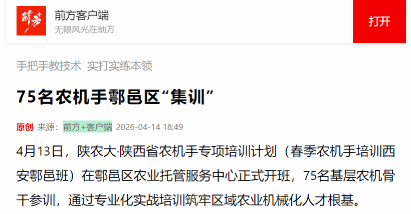 4月13日,陕农大·陕西省农机手专项培训计划(春季农机手培训西安鄠邑班)在鄠邑区农业托管服务中心正式开班,75名基层农机骨干参训,通过专业化实战培训筑牢区域农业机械化人才根基。