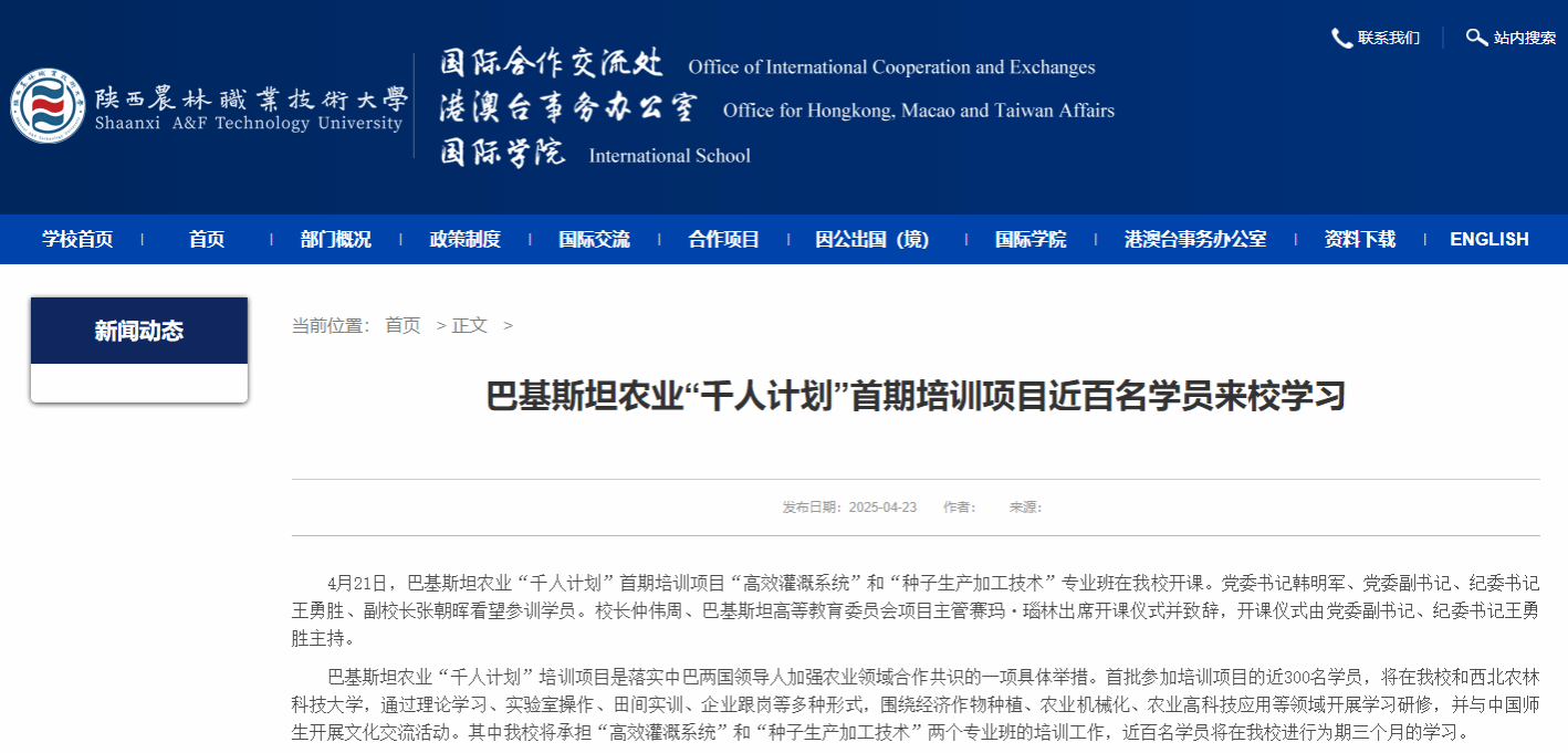 巴基斯坦农业“千人计划”培训项目是落实中巴两国领导人加强农业领域合作共识的一项具体举措。首批参加培训项目的近300名学员,将在我校和西北农林科技大学,通过理论学习、实验室操作、田间实训、企业跟岗等多种形式,围绕经济作物种植、农业机械化、农业高科技应用等领域开展学习研修,并与中国师生开展文化交流活动。其中我校将承担“高效灌溉系统”和“种子生产加工技术”两个专业班的培训工作,近百名学员将在我校进行为期三个月的学习。