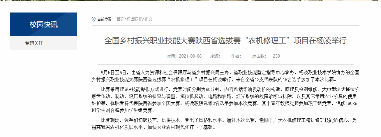 9月5日至6日,由省人力资源和社会保障厅与省乡村振兴局主办、省职业技能鉴定指导中心承办、杨凌职业技术学院协办的全国乡村振兴职业技能大赛陕西省选拔赛“农机修理工”项目在杨凌举行,来自全省13支代表队的15名选手参加了本次比赛。